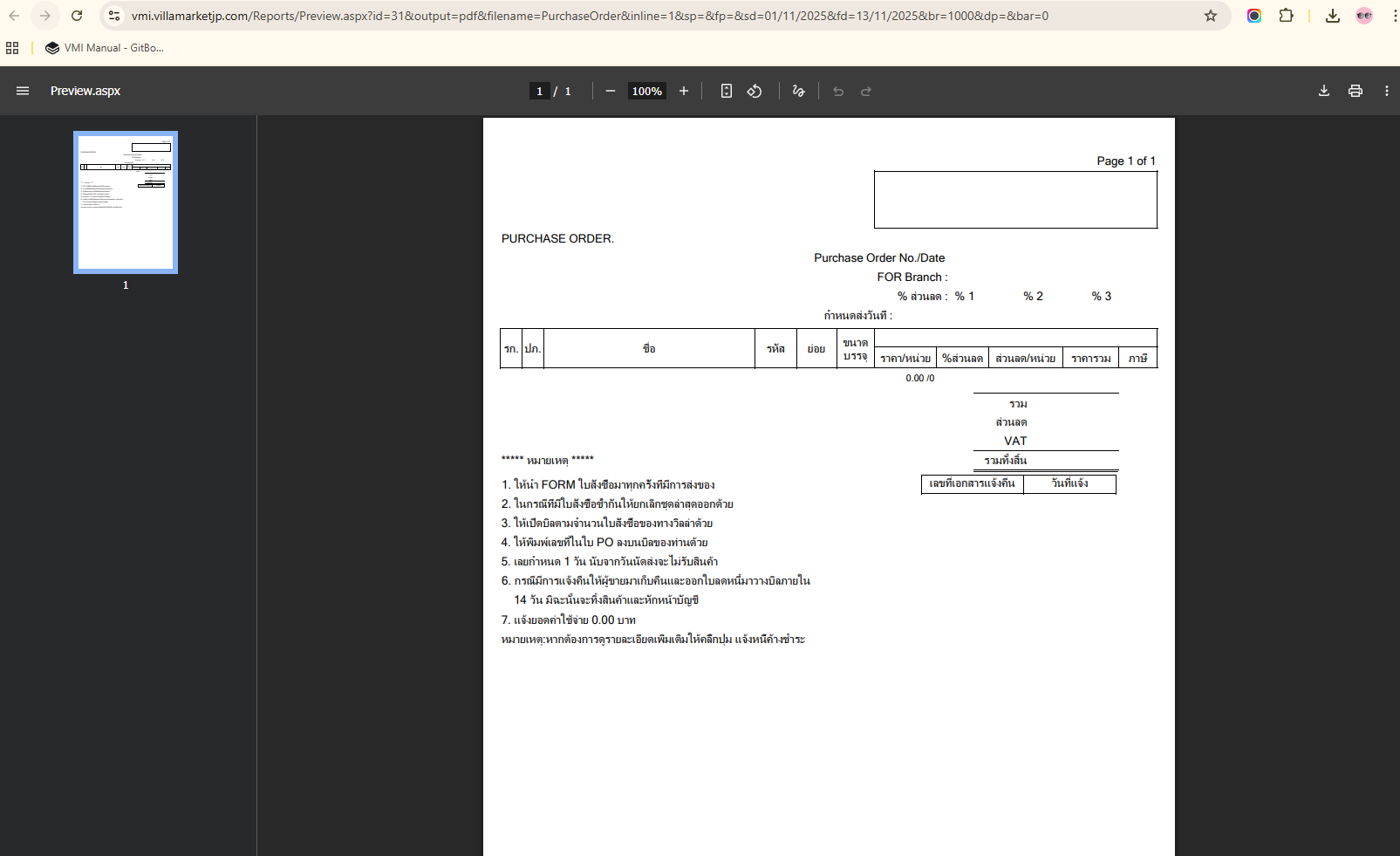 The Purchase Order (PO) is an official document issued by Villa Market to suppliers to confirm the purchase of goods. A PO contains product details, quantities, delivery dates, and additional purchasing information. It is a key document within the VMI system for controlling procurement and delivery processes.
