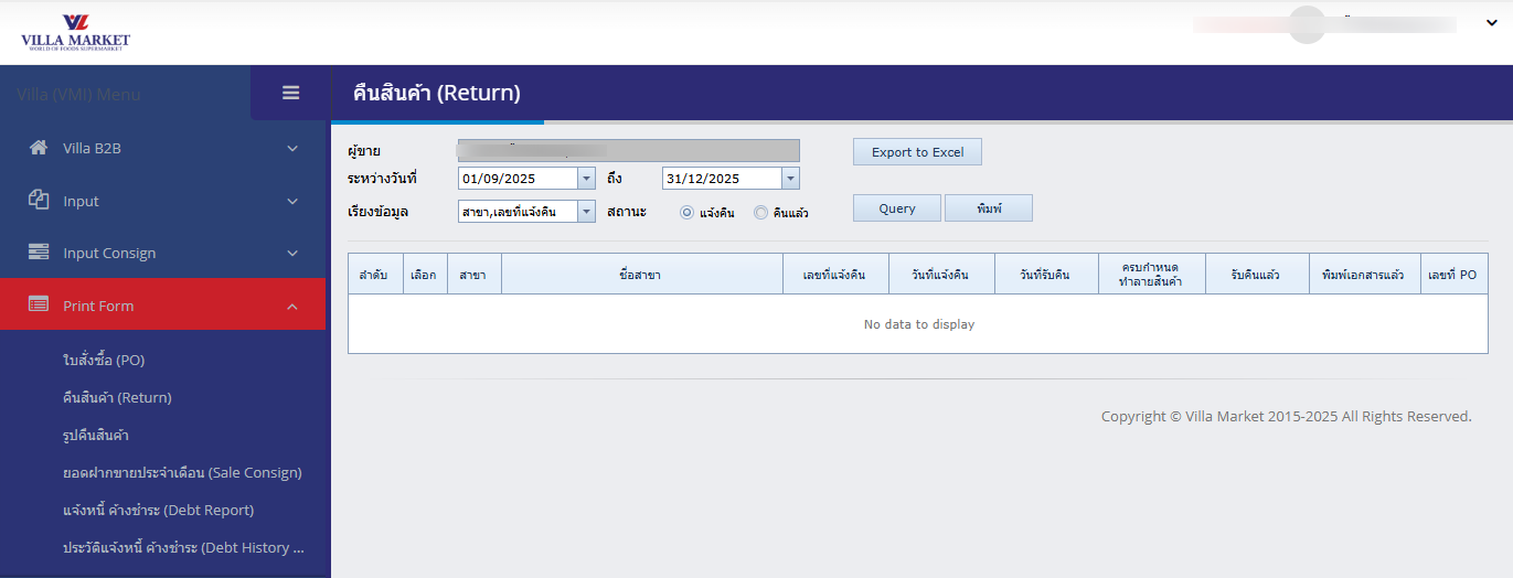 The Return menu is used to review all products that have been returned from Villa Market back to the Supplier. This usually occurs when the product cannot be sold—for example: